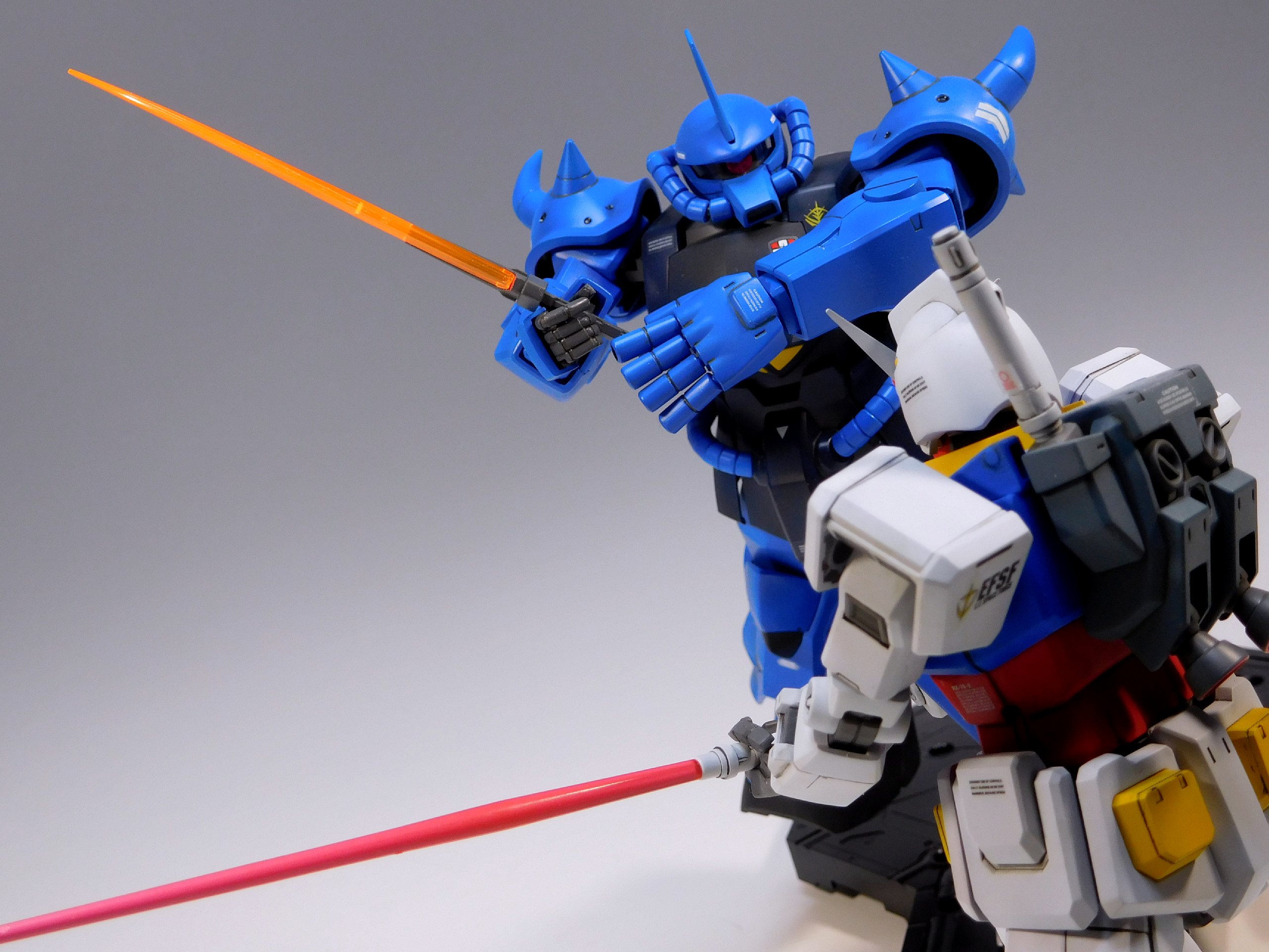 設定上の開発系譜として、地上用ザクを改良強化した機体がグフ。そういえば旧キットのパッケージに『改良強化新型』と書かれていたのを覚えています。