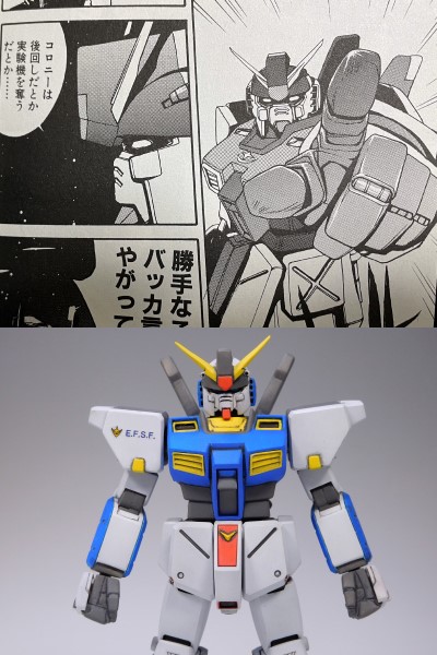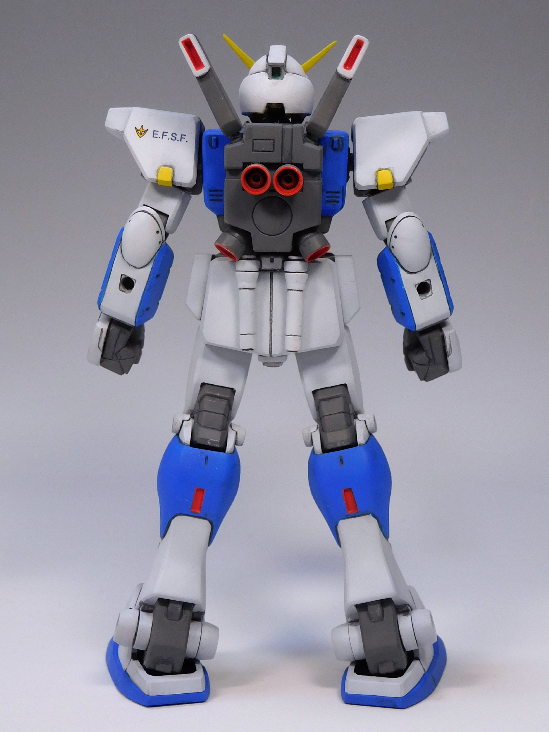 頭と肩(肩は内部フレームに装甲版追加)を交換、胸のダクトは形状変更、原作と大きく違うのは連邦マークの位置。ジム・コマンドと同じ位置だった胸の中央から腰へ、しかもガンダムと同じVの字に変更しちゃいました(笑)。
