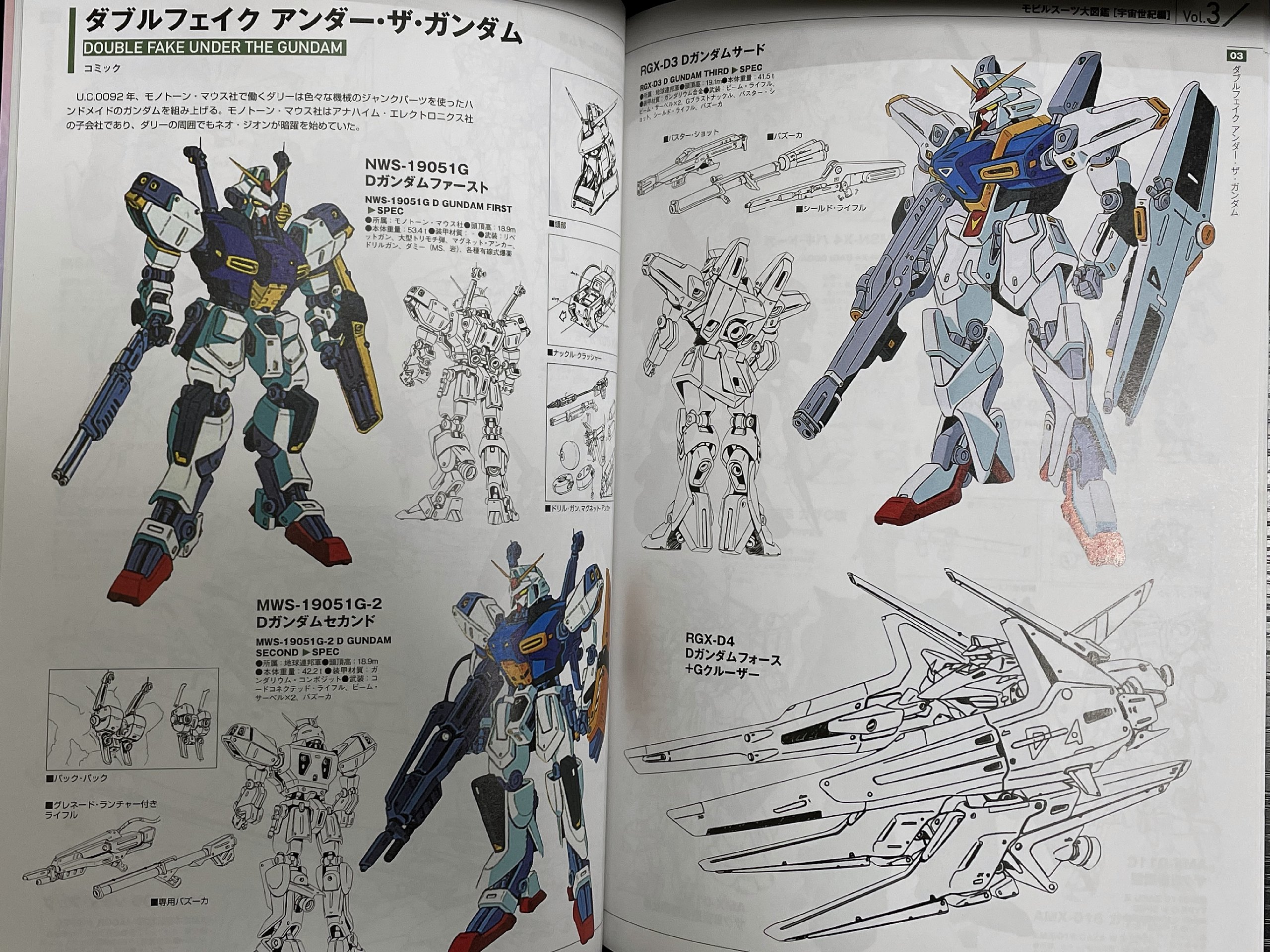 こっちが本当の主役機『Dガンダム』です。1st~4th(劇中には未登場)まであって、4thのGクルーザーくらいになると凄く惹かれるのですが、残念ながらMSの設定画はないみたいなんですよね……。