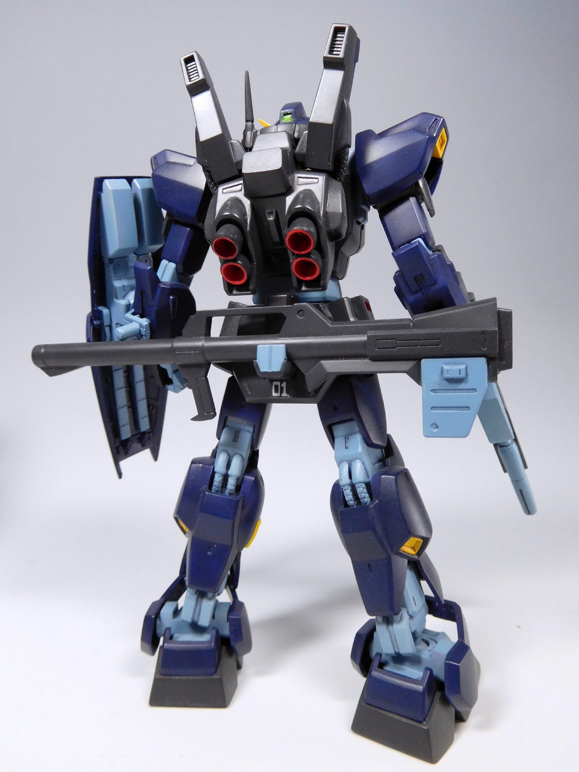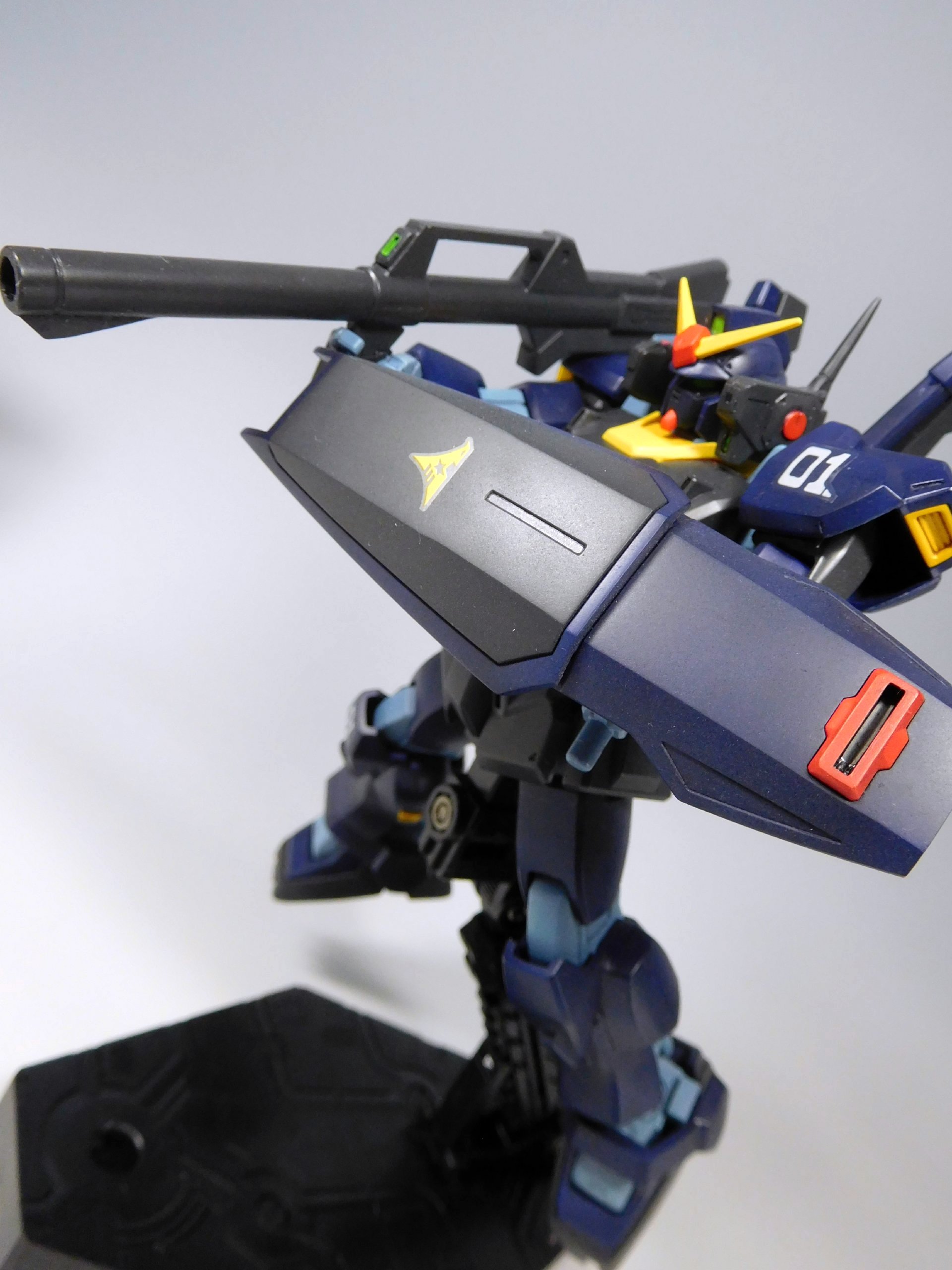 同時期に製作・撮影予定のヘイズル予備機と合わせる形で、自分にしては珍しくHGサイズで盾にもデカールを貼りました。元々の機体番号シールとマッチして、これはこれでアリだったかなと思います。