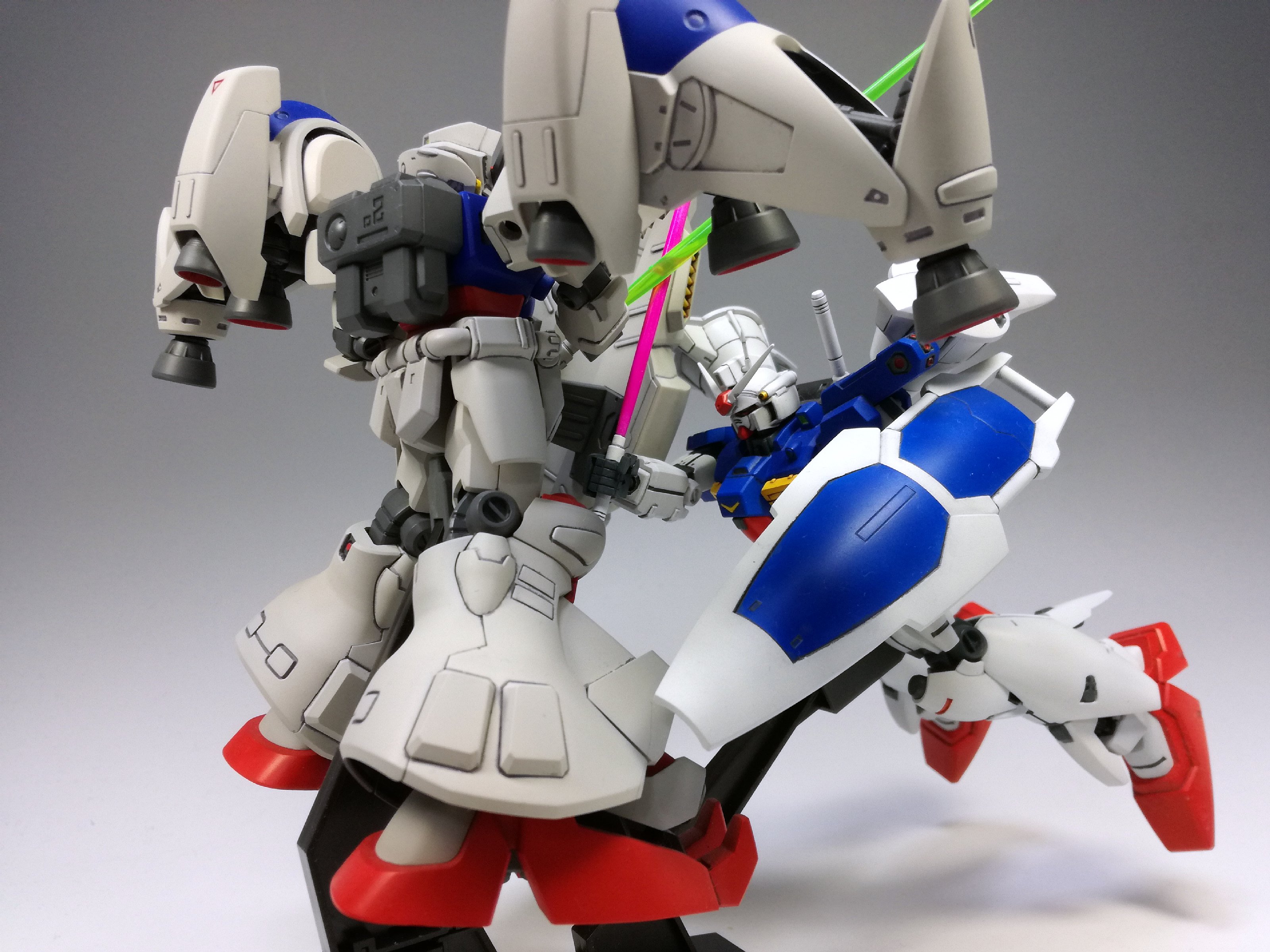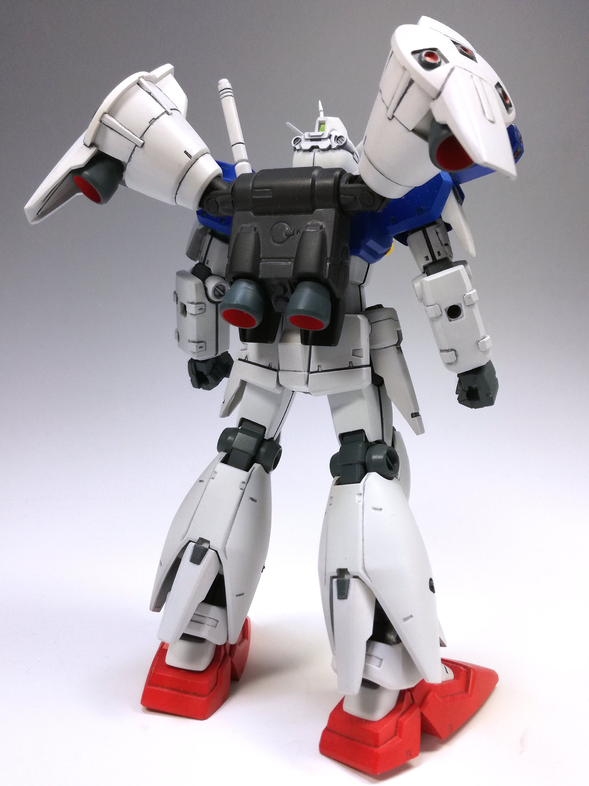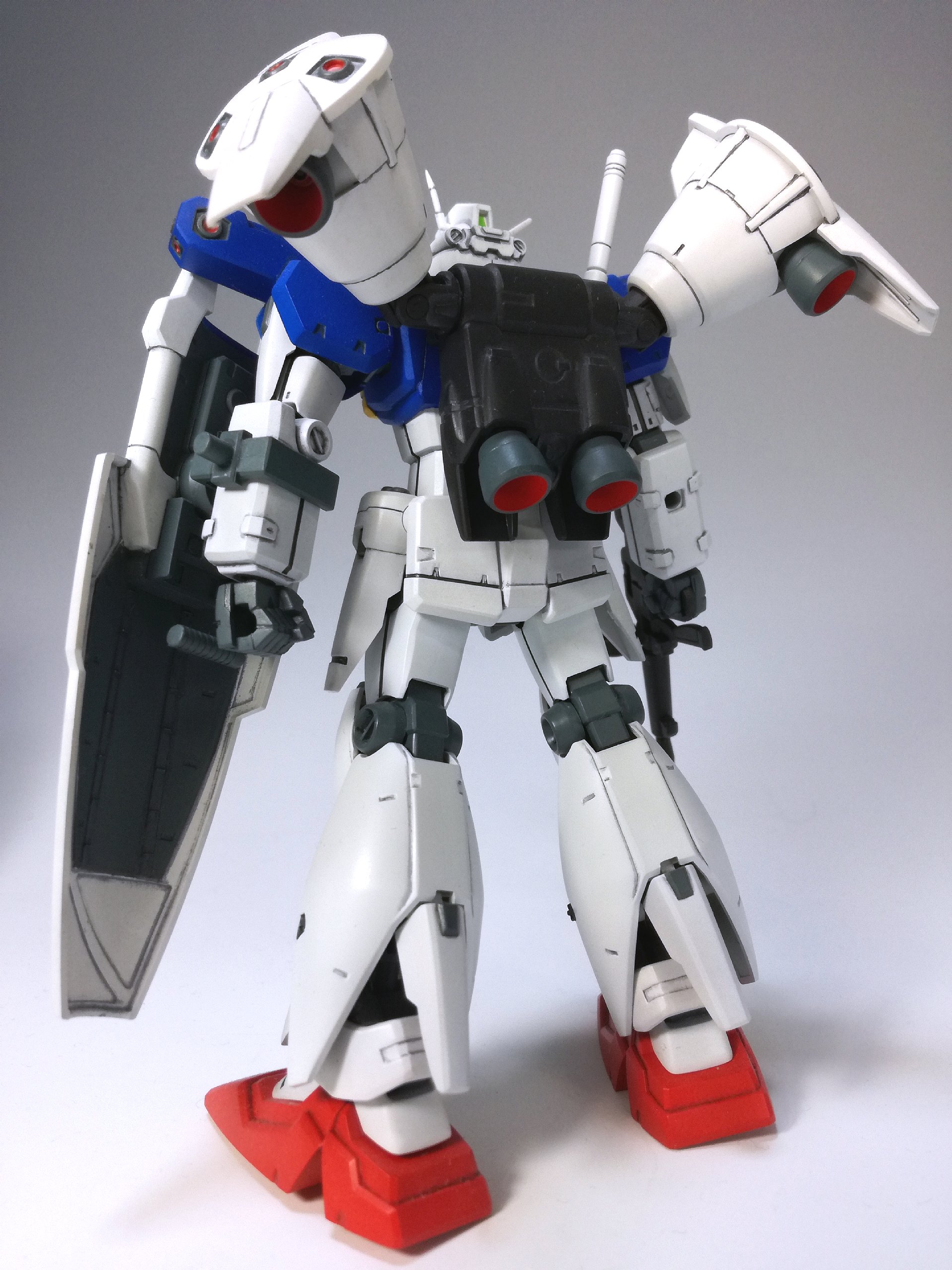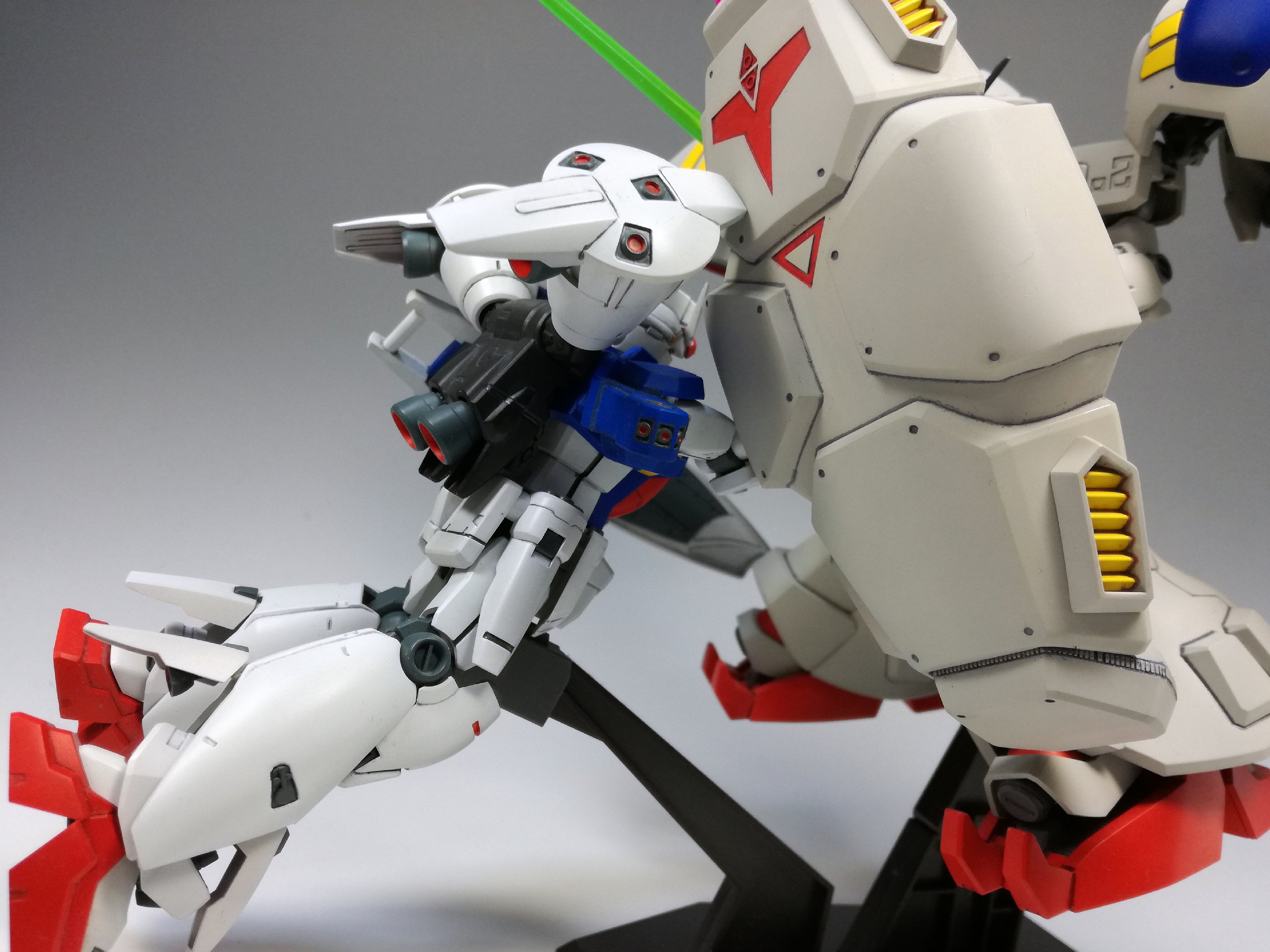 ただでさえ大変なところ、元々の胸・肩の飛び出したバーニアがどうしても気になり、閉じた状態へ改造することにしたものだから、2号機をMLRS装備まで作ったのと変わらないくらい、こっちも手間がかかりました。でもこうやって眺めて見ると……どんなものでしょう? その甲斐はあったかな??
