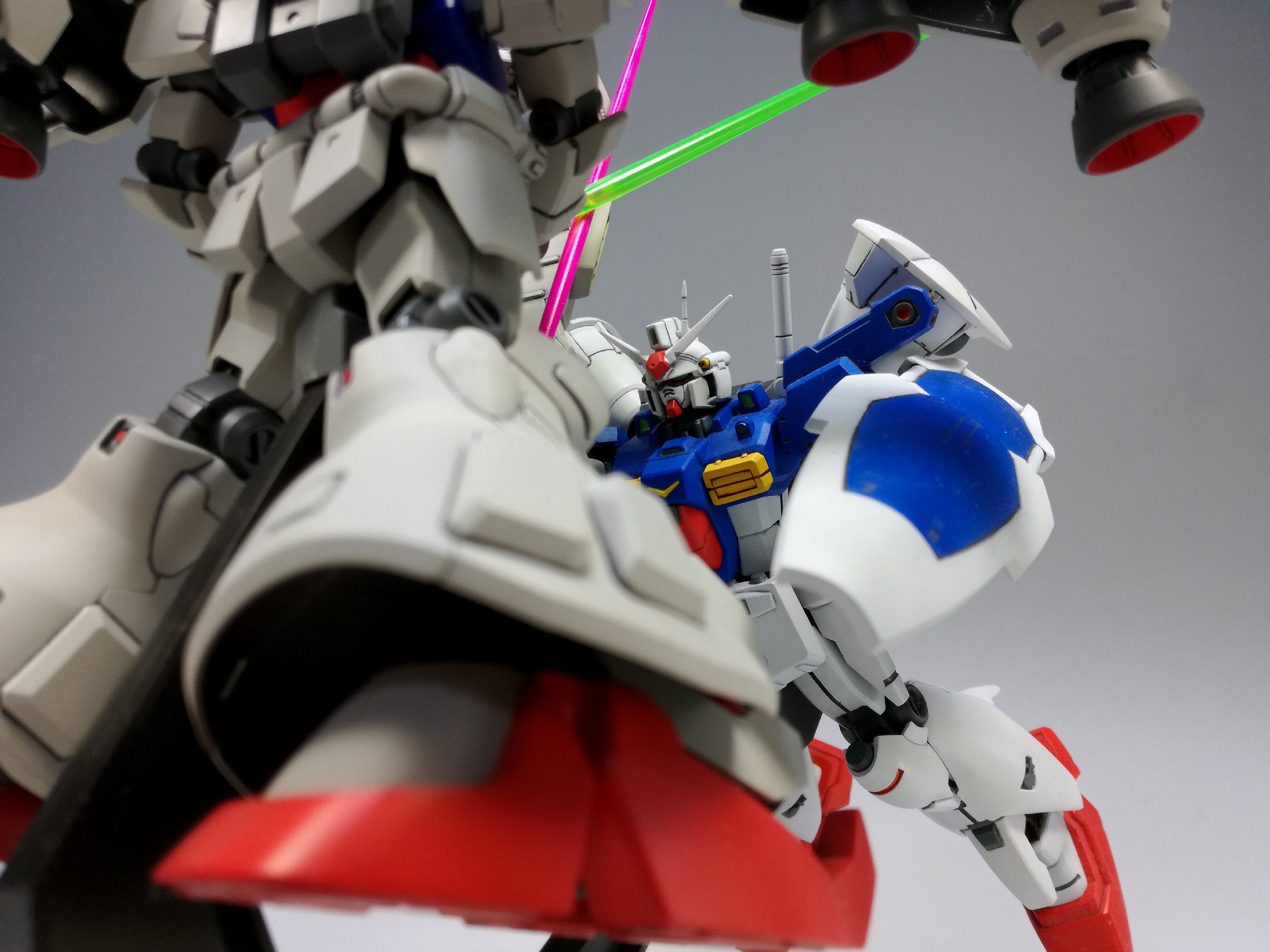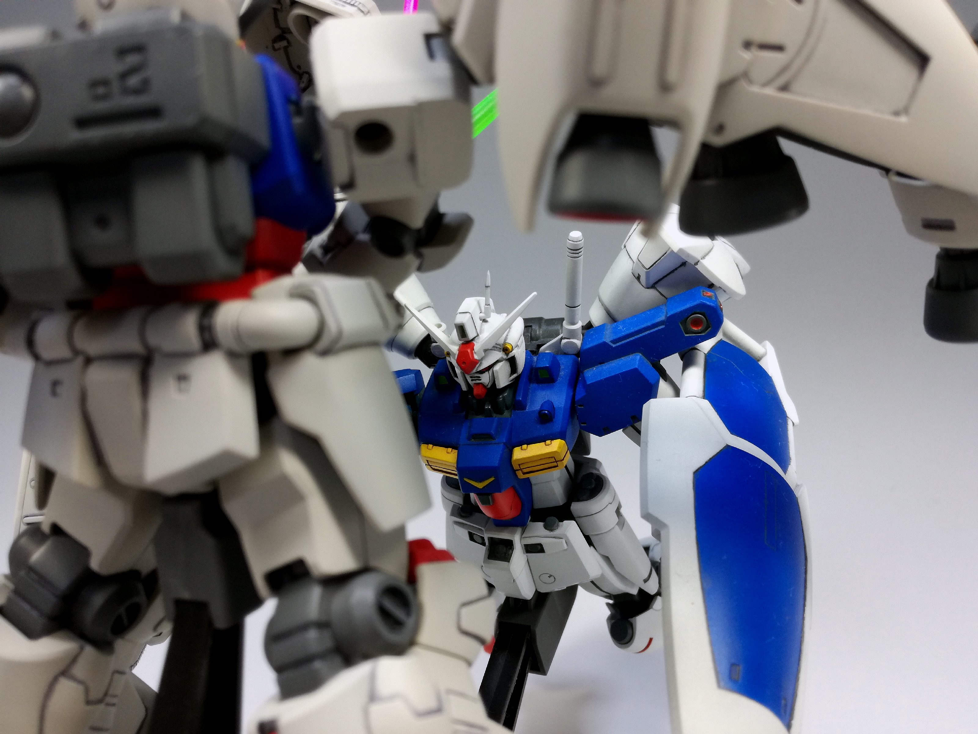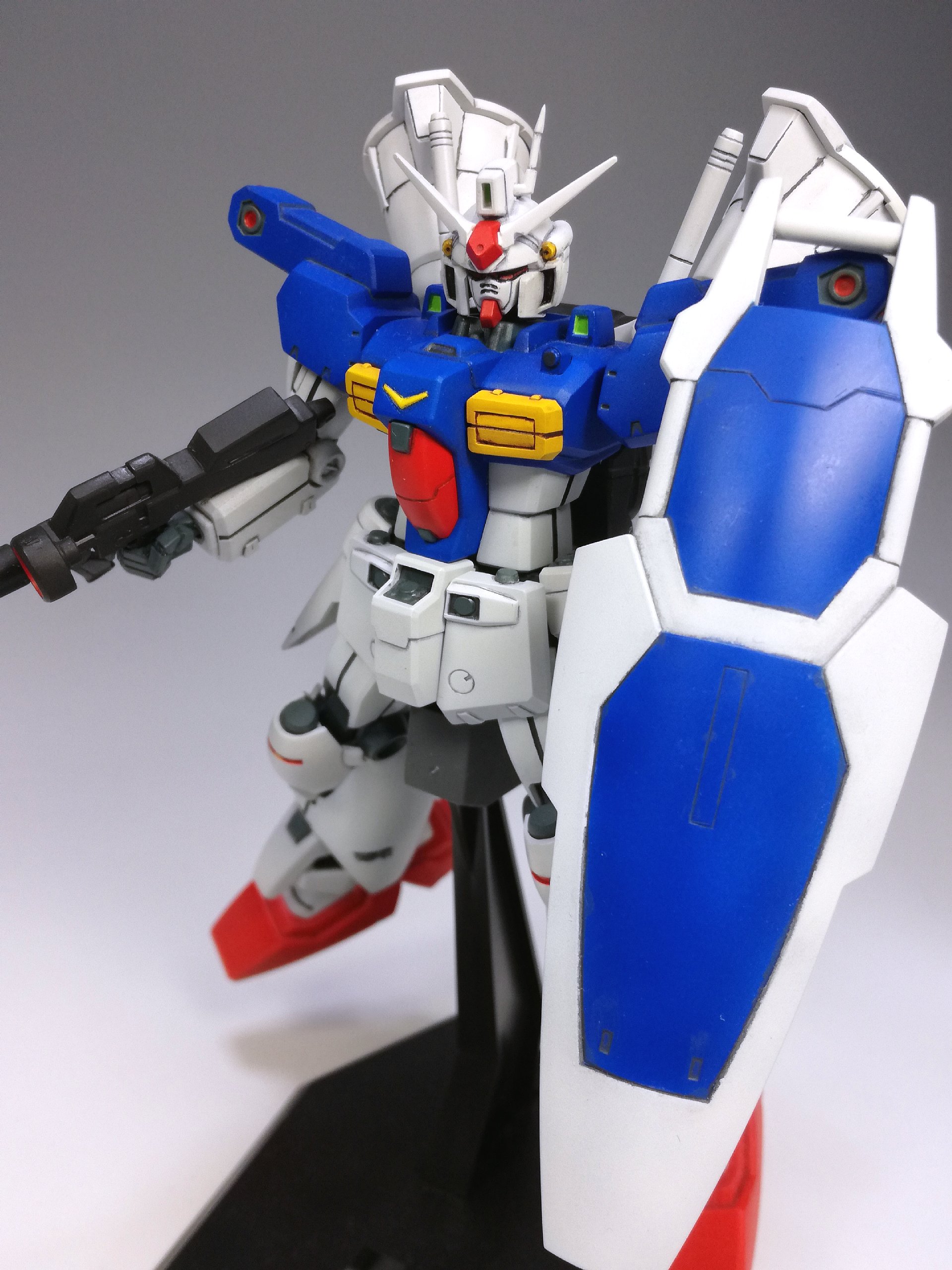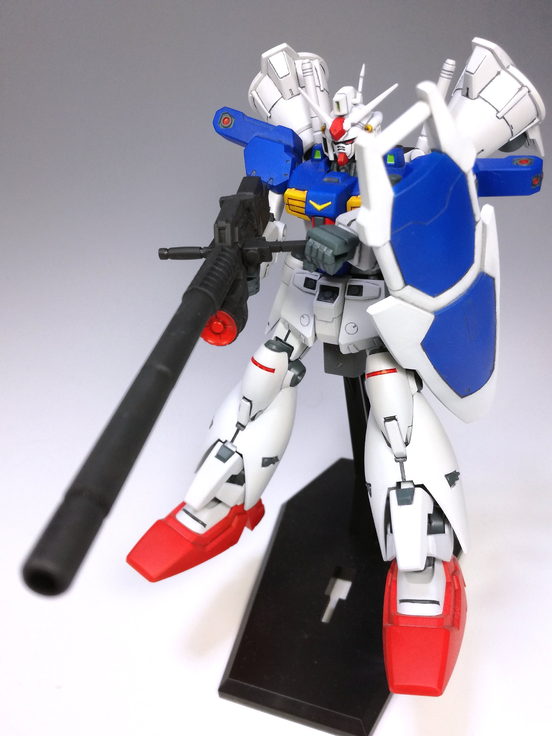 ただでさえ大変なところ、元々の胸・肩の飛び出したバーニアがどうしても気になり、閉じた状態へ改造することにしたものだから、2号機をMLRS装備まで作ったのと変わらないくらい、こっちも手間がかかりました。でもこうやって眺めて見ると……どんなものでしょう? その甲斐はあったかな??