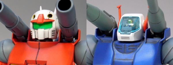 ・HGUC第一弾であるため、それ以前の製品のポリ部品が多く流用されてたりします。軟質樹脂製の持ち手や握り手なども付属するのですが、ガンキャノンとはデザインが異なるため(というか、そもそも取り付け部の形がちがう)、どれも流用できません。初期のHGUCにありがちな、右手に必ず武器を持つ前提(ライフル持ち手のみ)、左は平手のみとなり、ポーズに幅がありません。――唯一の救いは、メモリアルポーズ用の両平手が付属することでしょうか。肉抜き穴が大きいので、埋めるのに一苦労/それっぽく彫り込むのにも一苦労……。