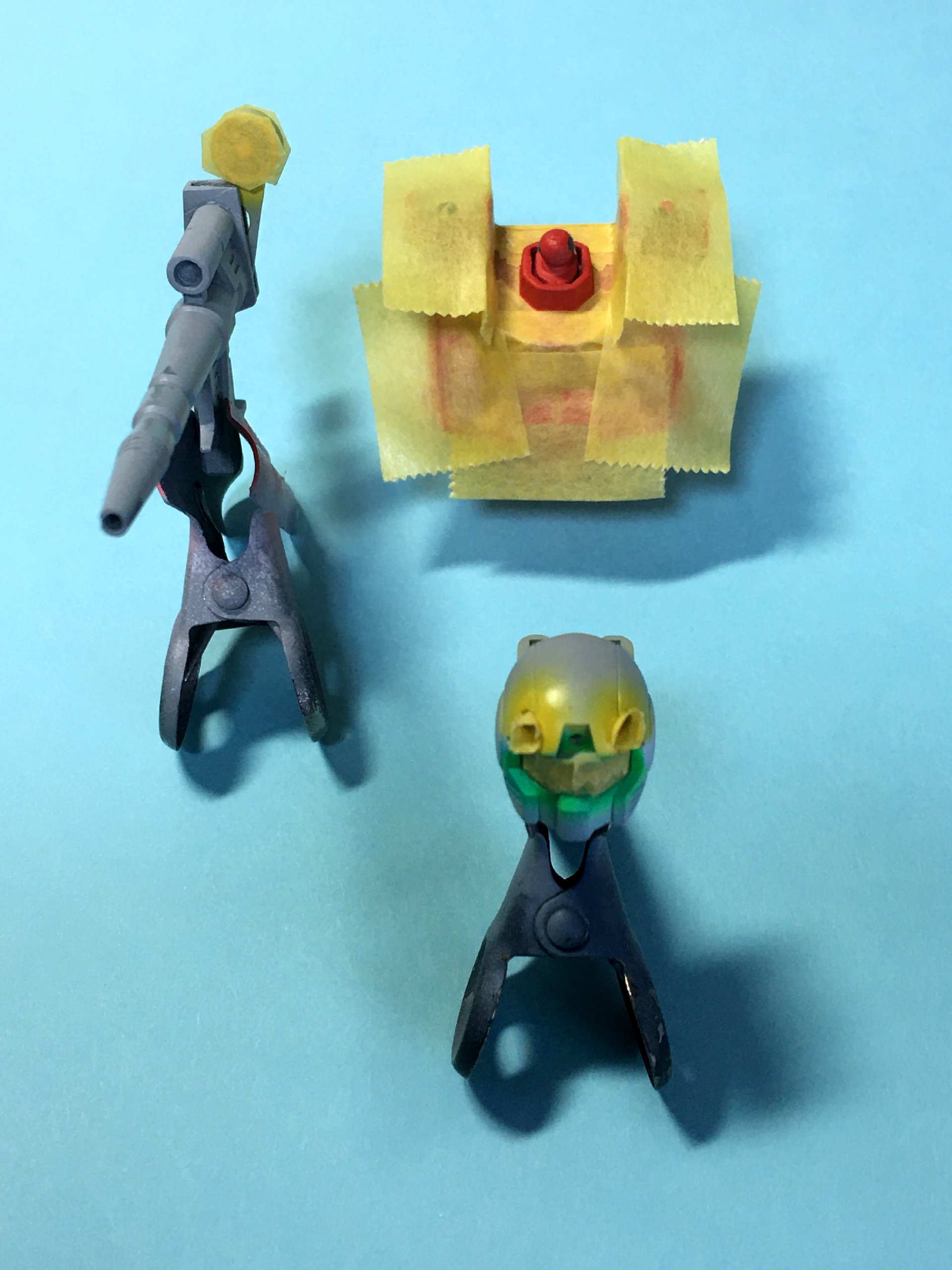 - ちょっぴりマスキングの後、黄色部分を塗装。頭部を接着中。