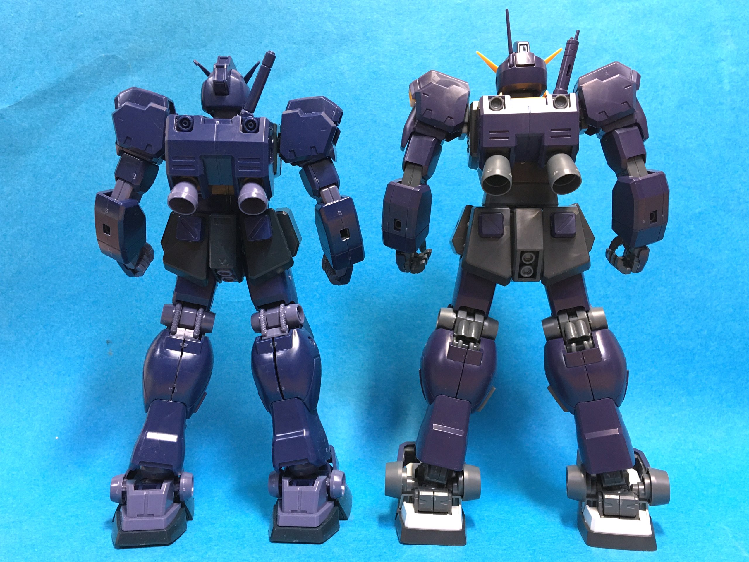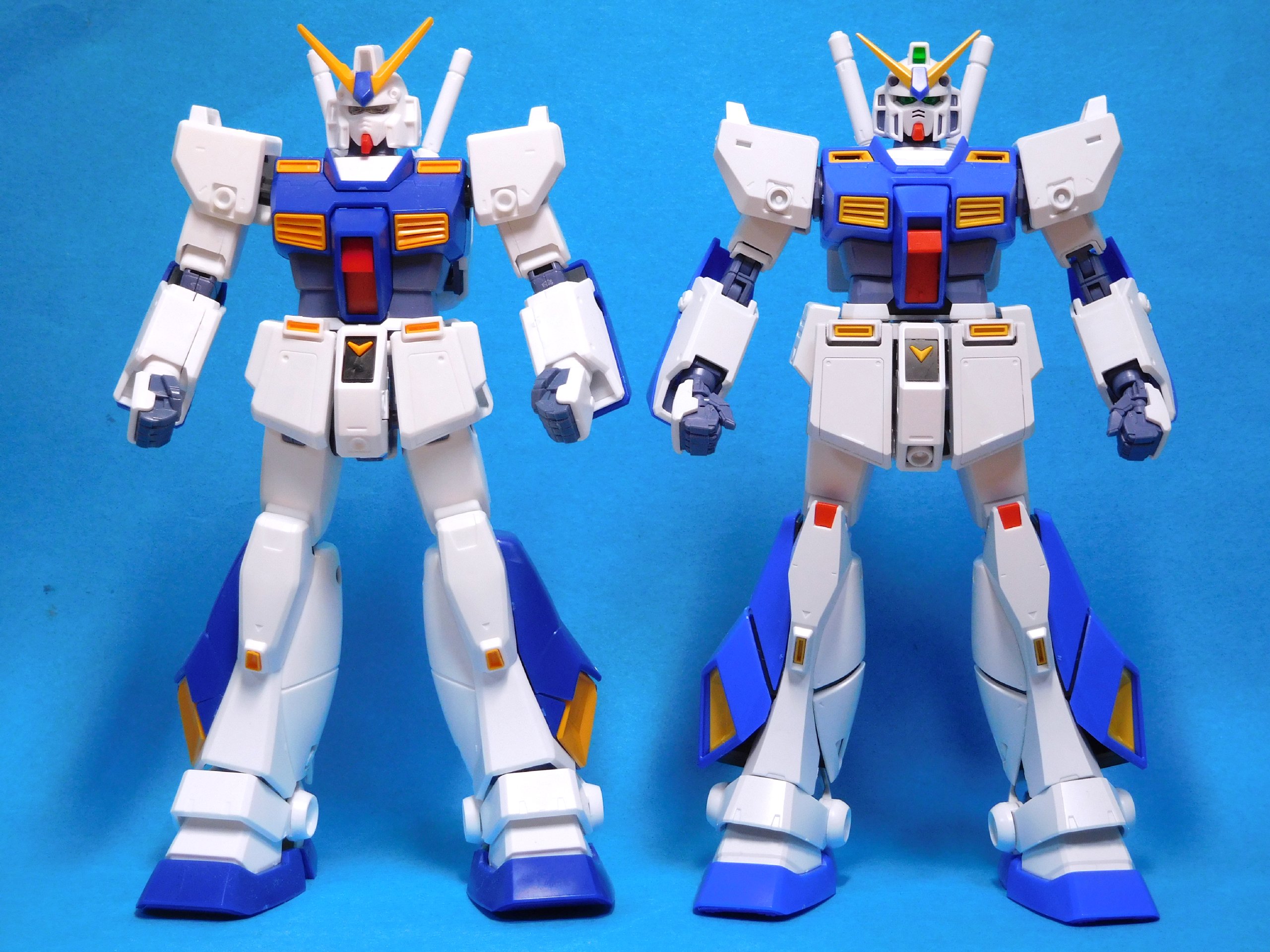 同じMGで旧バージョン(左)とVer.2.0(右)を比較すると、Ver.2.0の方がこの素組みの状態で、既に色分けがすごい!!……のはまあ置いといて、頭が小さく脚が細くなっているのがわかりました。