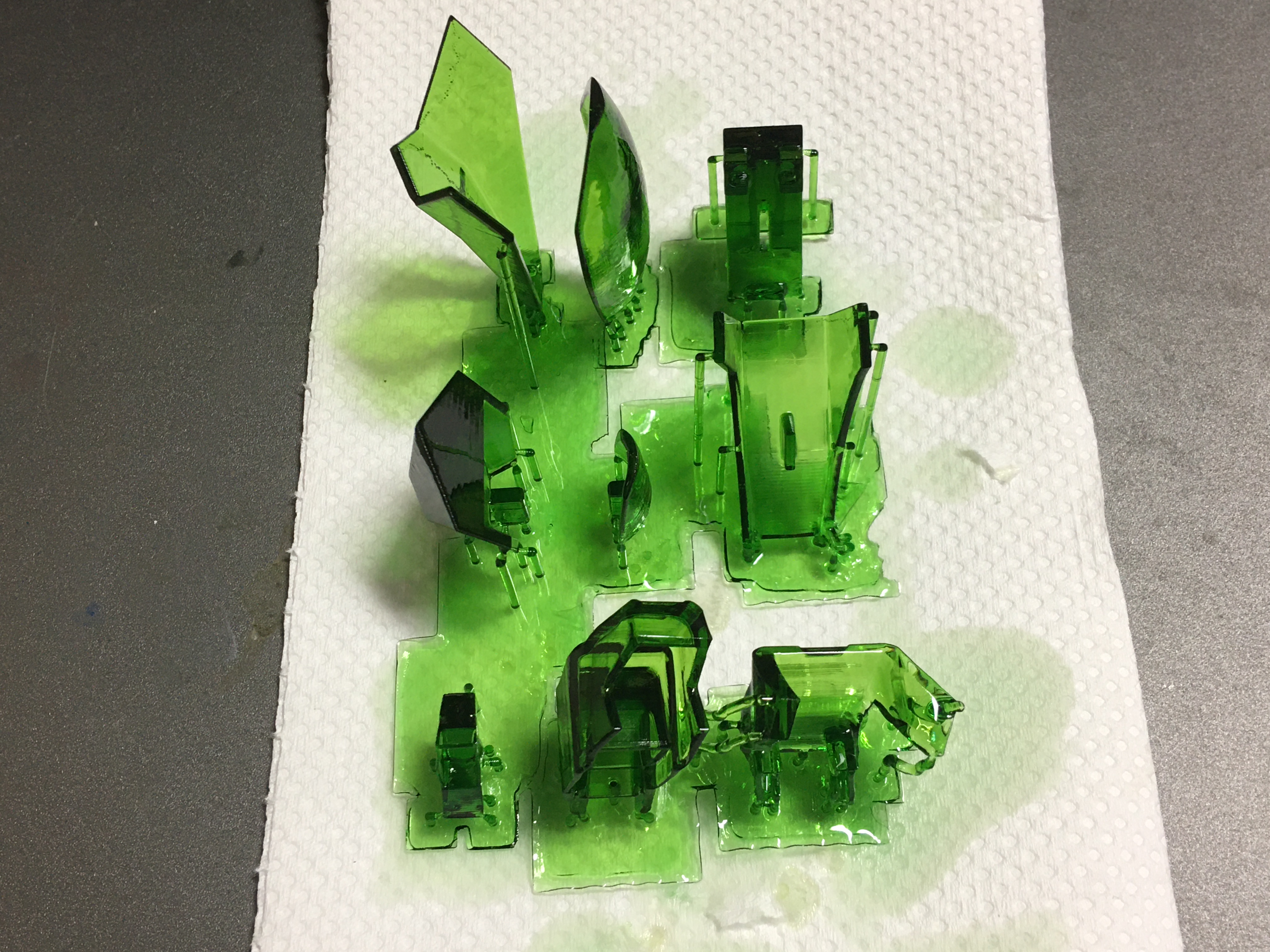 ボチボチ完成してきたレジンパーツ。片足首とサイドアーマー、足首フレームを継目消し後、洗浄。アンクルガードも片足側を改造。1mmシンチュウ線を軸にして接着。いずれも乾燥中。 - 2020/08/17