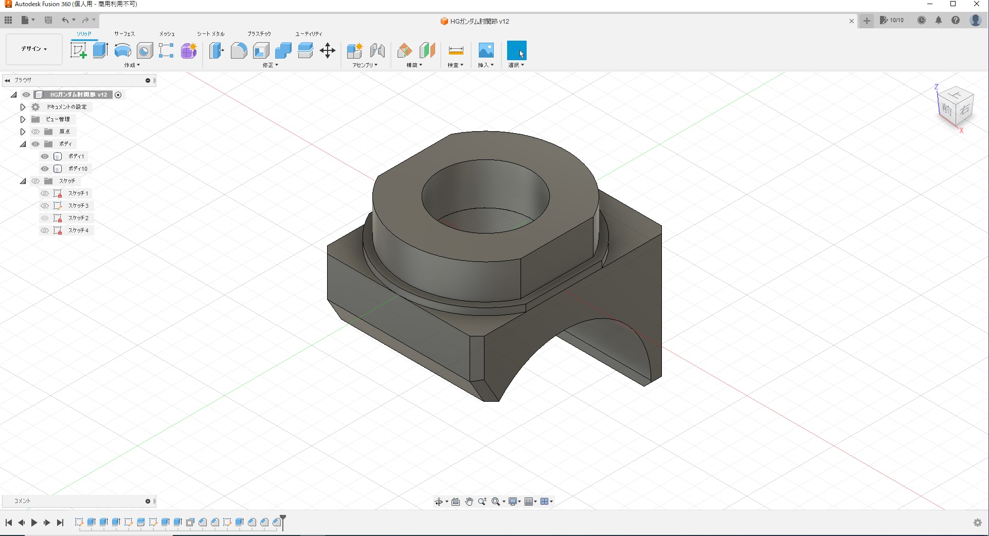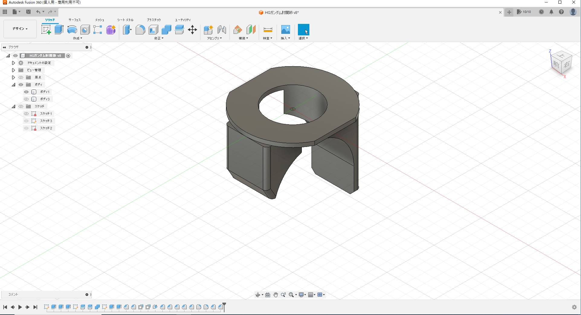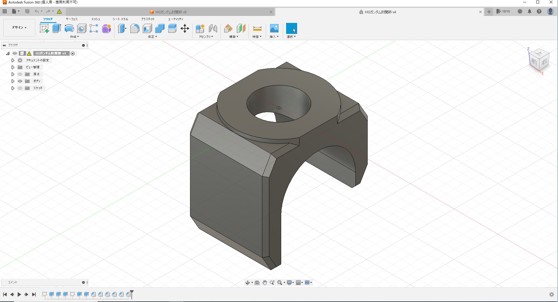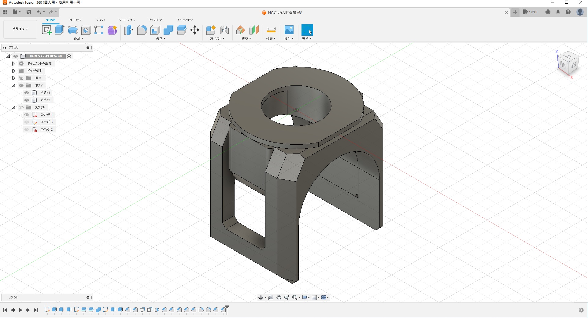- 肘関節を製作。組み合わせ幅を修正後、アルティマでポリ部品にペーパーがけ。ポリ部品へのペーパーがけは、特に楽になった気がする……。上腕、太腿を接着中。