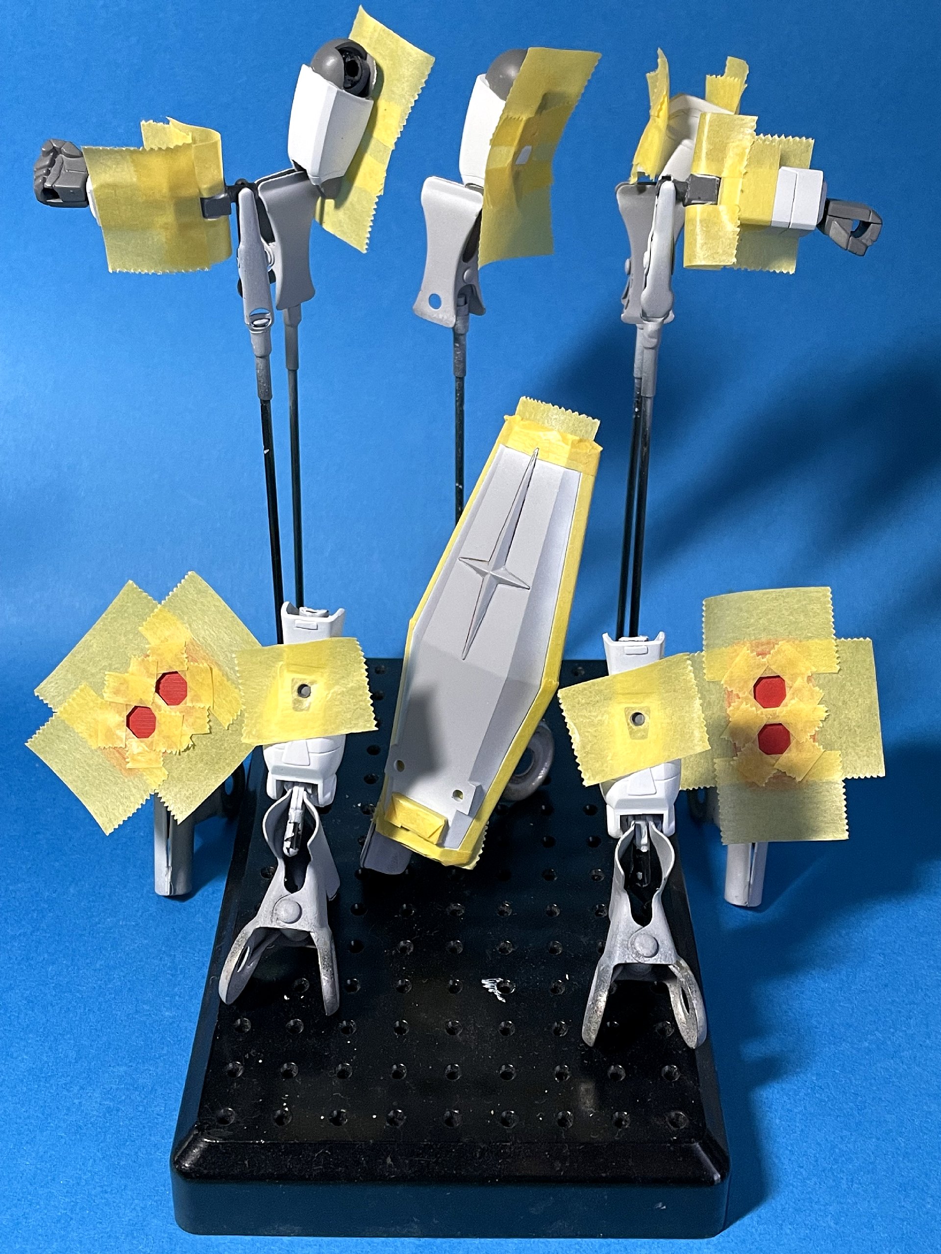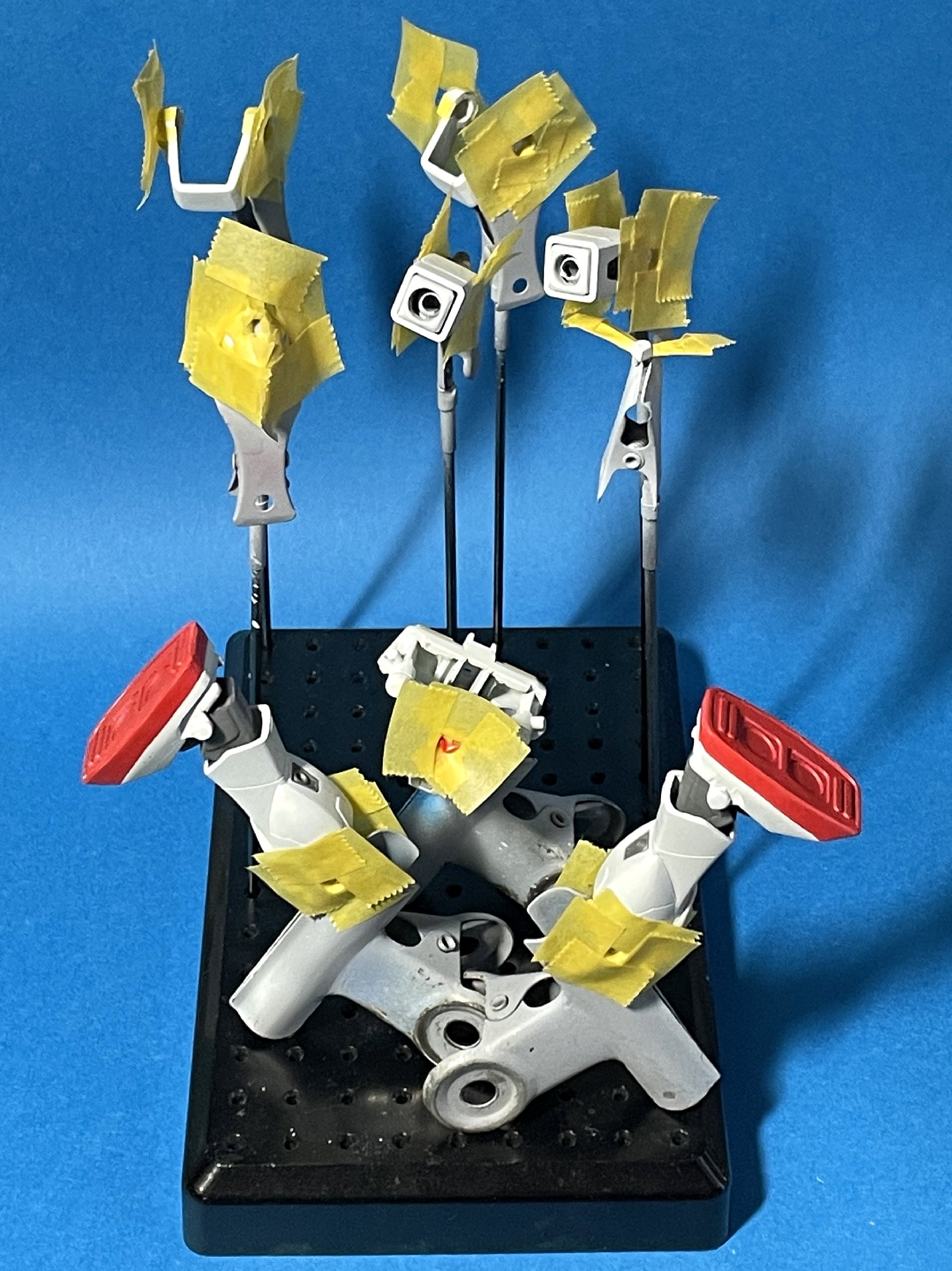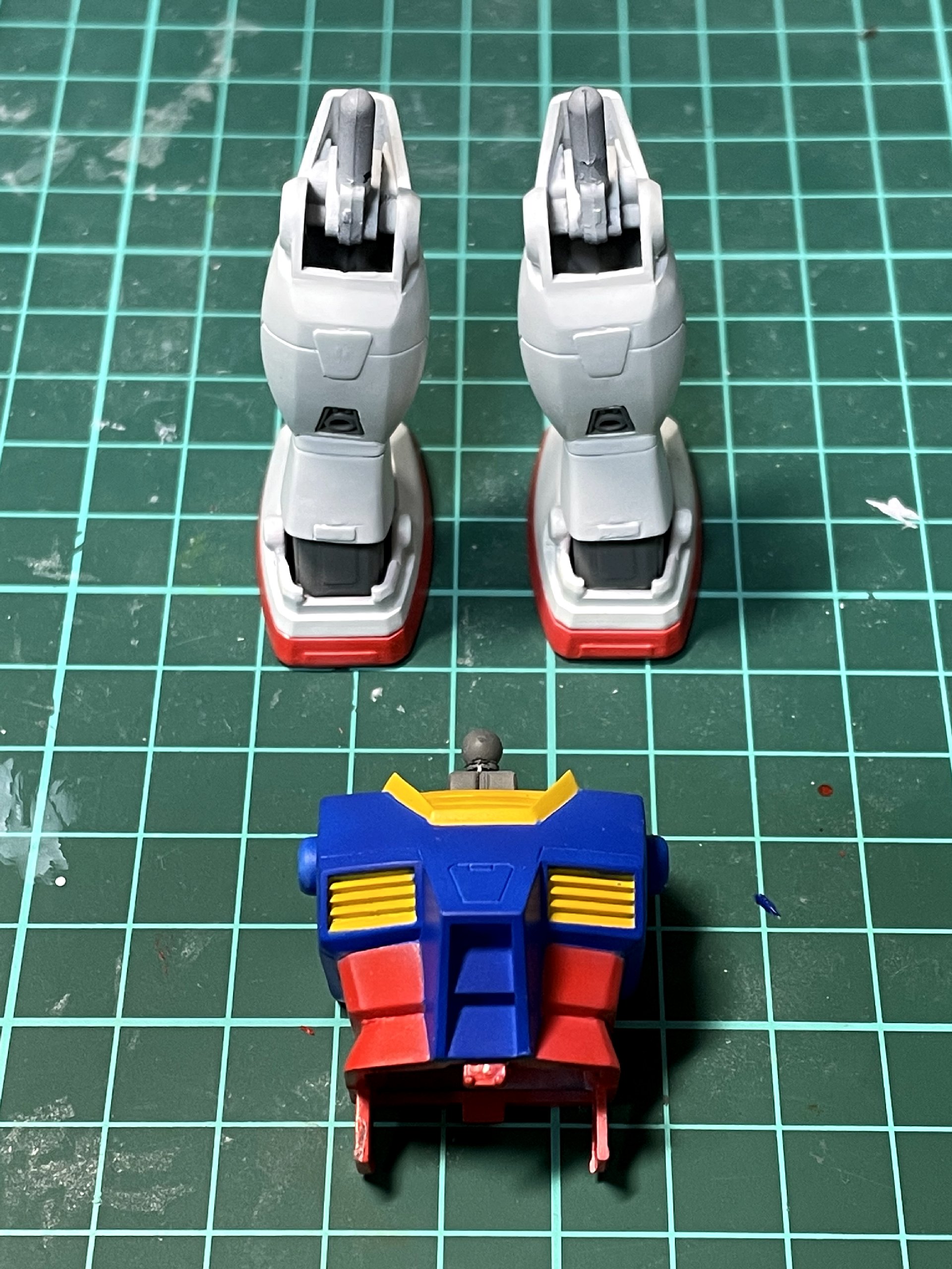 夜になり、まあまあ納得できる仕上がりになったアンクルガードを白で塗装しようとしたところ、頭部裏の赤プラ部分が剥き出しだったことに気付く……。サフ吹きして乾燥中。塗装は合わせて明日以降に持ち越し。 - 2024/04/15