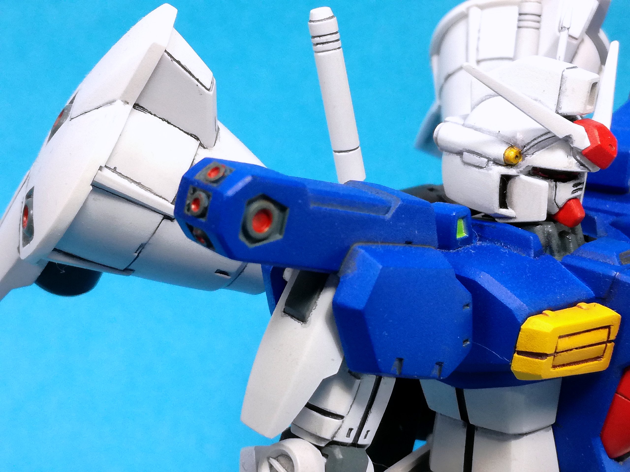 - 最後の難関、シールド(苦笑)。3時間かけて(汗)、マスキング&塗装。これで一通り塗装も終了!! ……と思ってたら、背中側数ヶ所、塗り分けし忘れてることが判明(涙)。こっちはスミ入れしながらやな。なかなか楽しませてくれるわぁ。