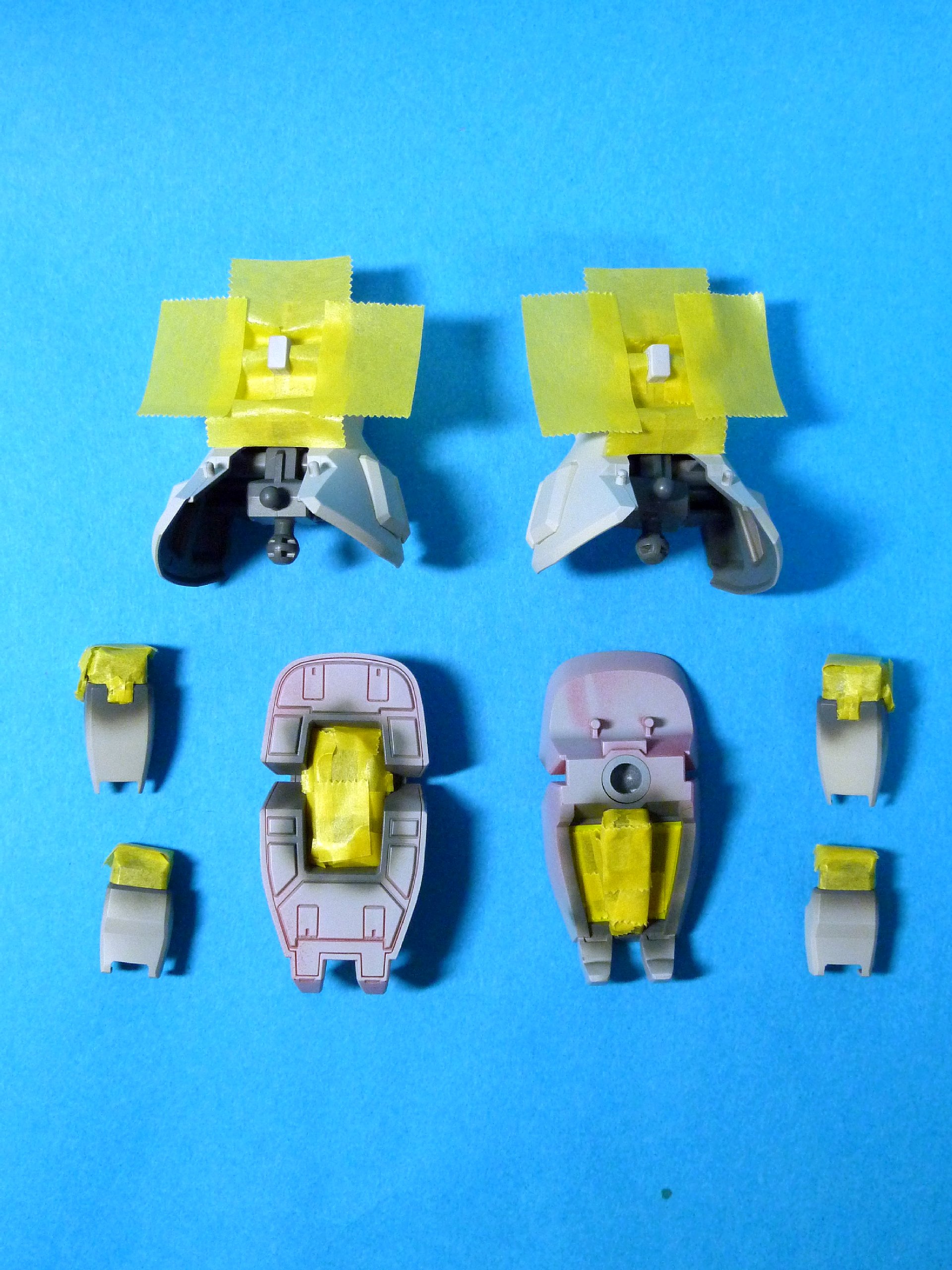 - グレー部分の塗装と脛部の継目消し。足首・脛・太腿(脚全部!(涙))をマスキング中。このマスキングが最後の山場……になってほしいよー。