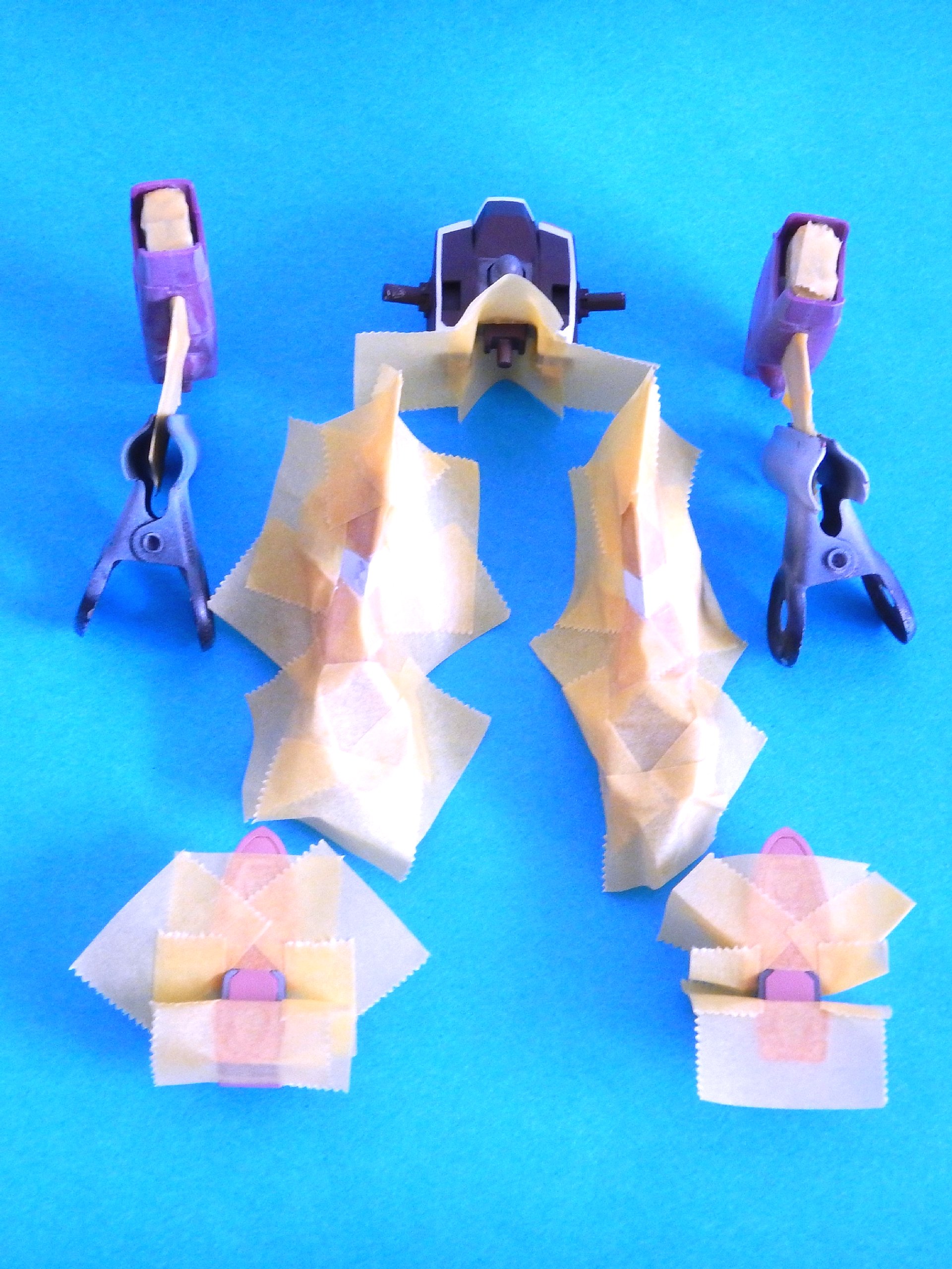 - 仮組をバラす。接着したら、足首も多少締まるのではないかと考え、一応そのままにした。各部を接着中。足首は若干強めにクリップ押さえ。