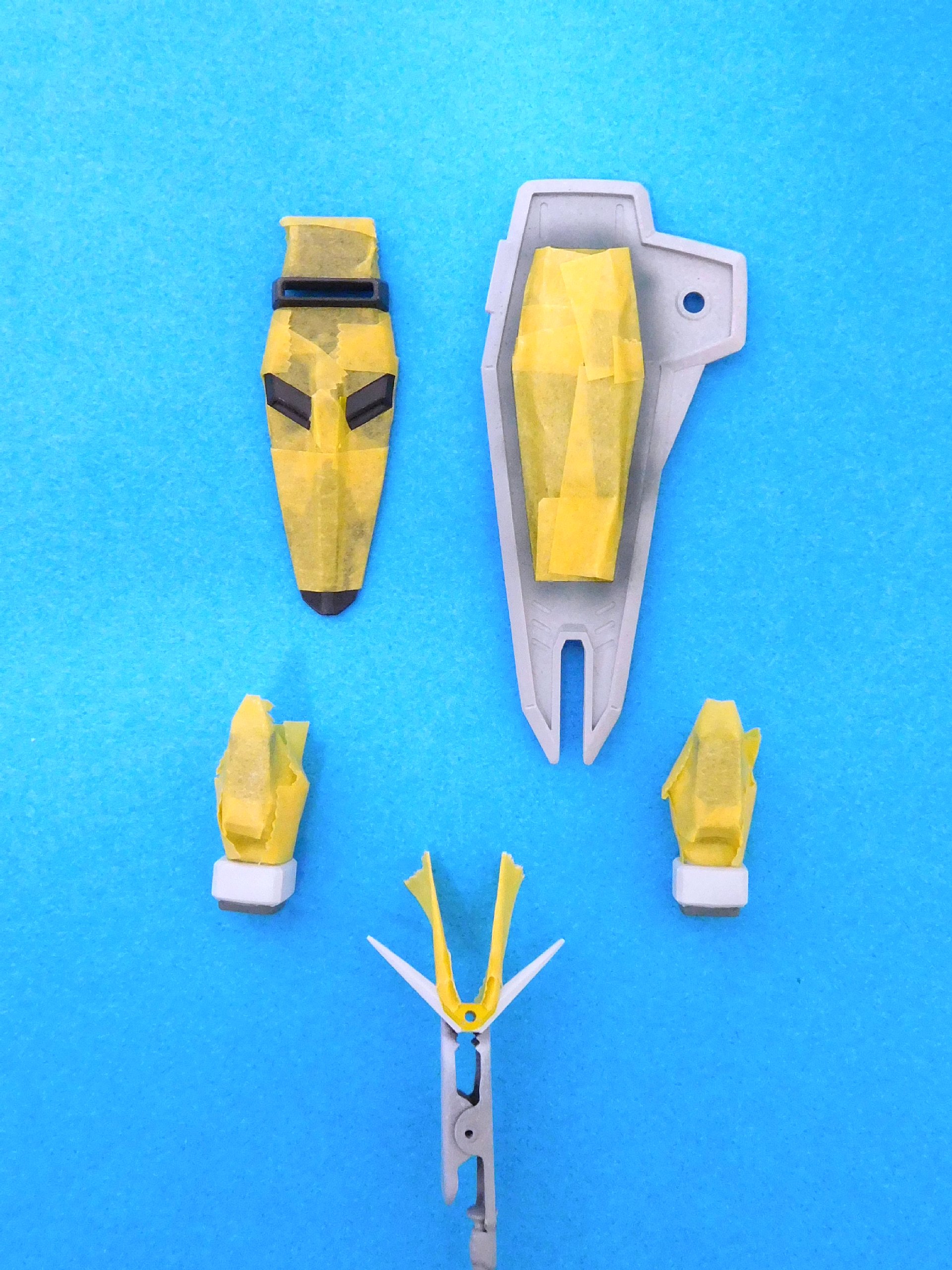 - 更にマスキング大会後、黄色部分を塗装。頭部を製作。サフ吹き、乾燥中。完成率80%!