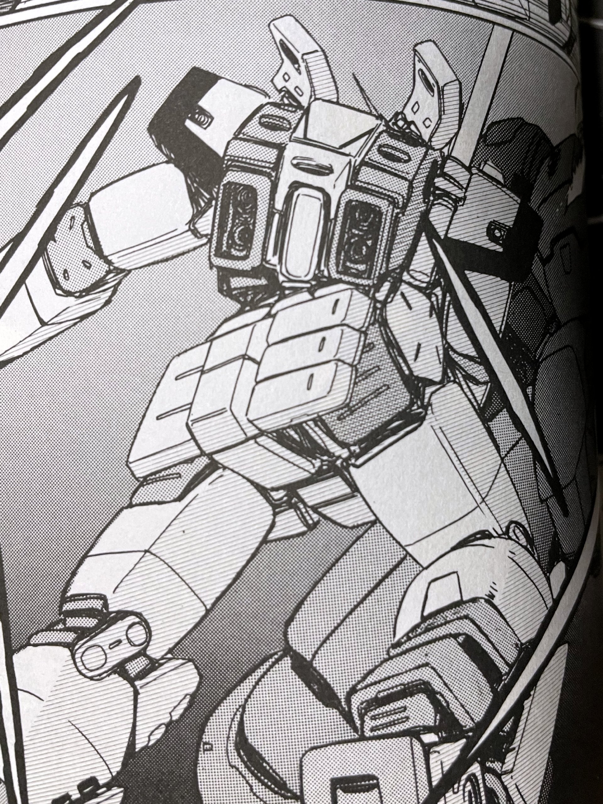 最初のバンダイ刊見開きイラストは連載終了後の最終的結論として描かれたとのことで、劇中とだいぶ異なってもいるのですが、今見ても結構ぶっ飛んでるというか……無人機という機体コンセプトは好きなので、自分なりにアレンジを加えて作ってみようと思い立ちました。(ファンの人が見たら怒られます、多分)