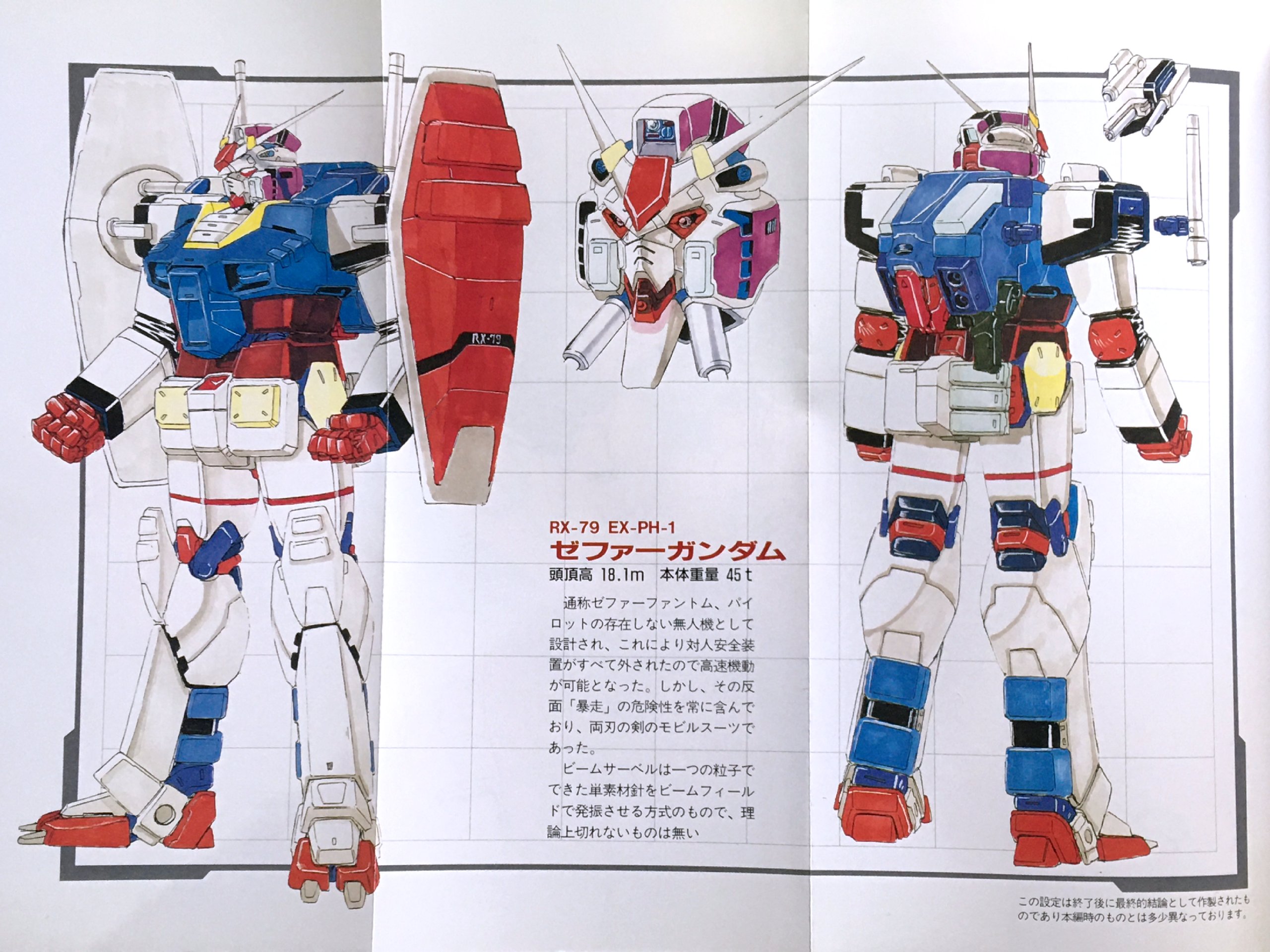 原作中ではガンダムとゼファーが向き合うシーンもあり、設定画だけ見ると両者は全然違っていますが、自分としては生物的な印象の強い顔以外の外観は非常に似ていたのではないかと想像しています(違って見えるのは作者の画風だと)。