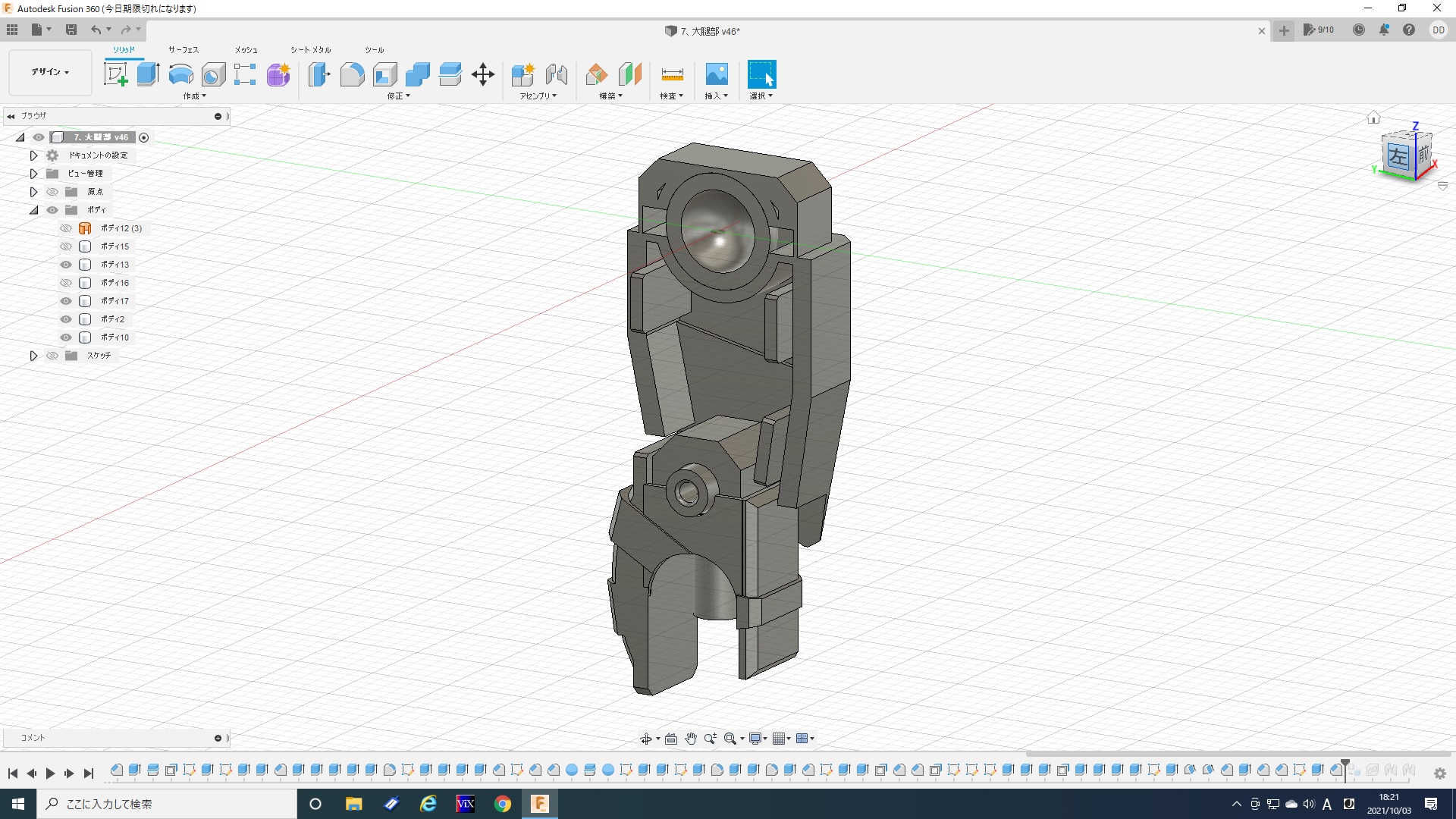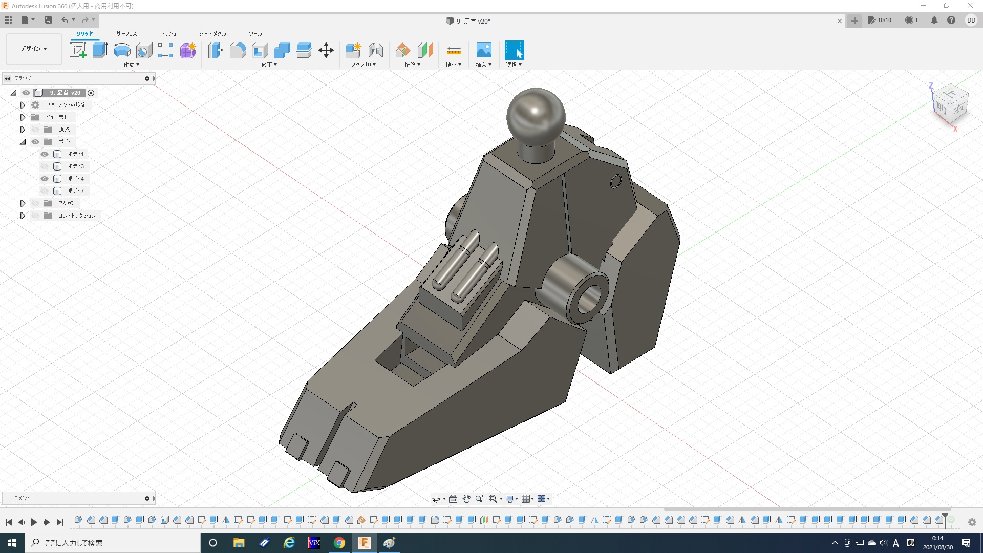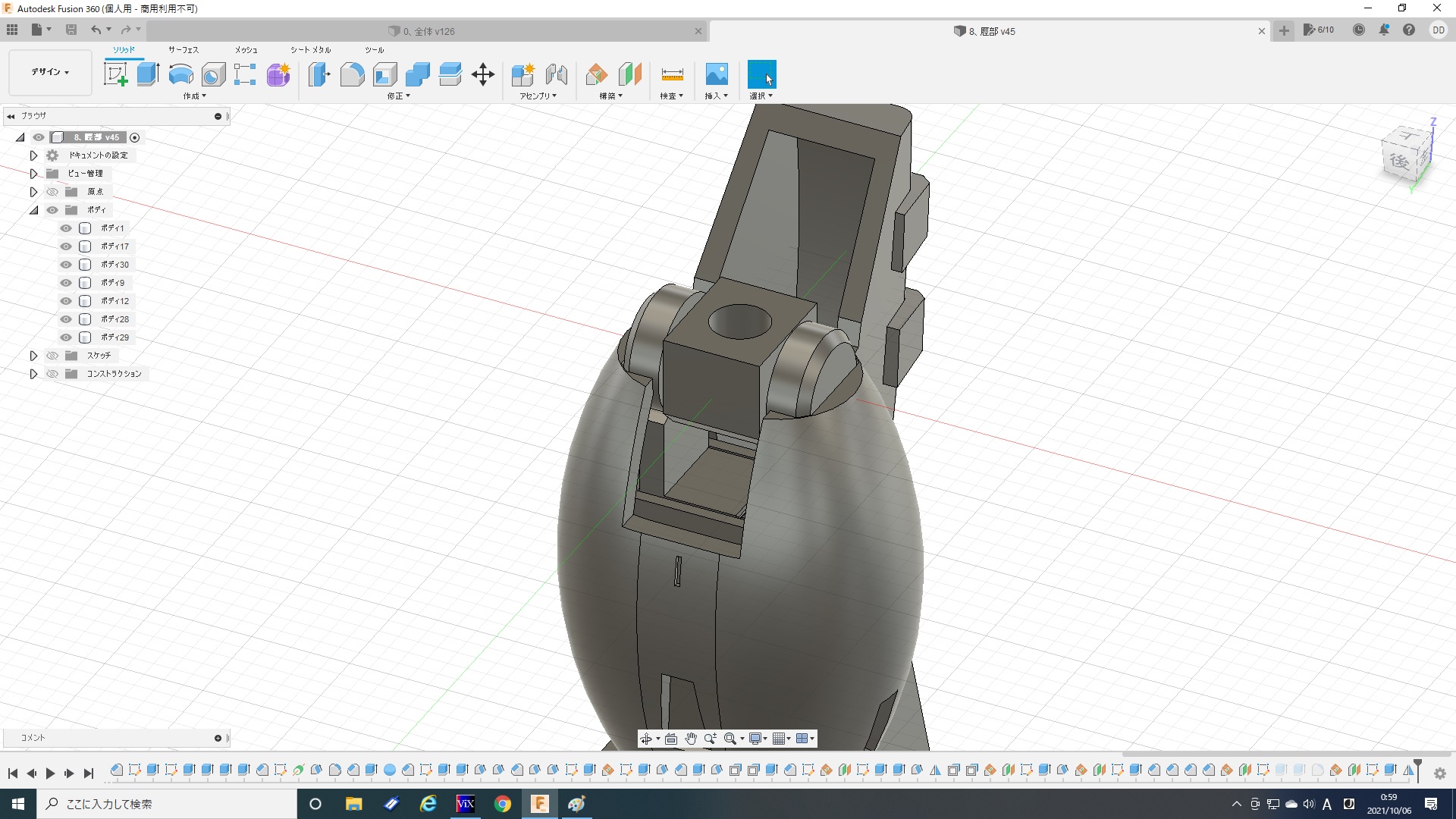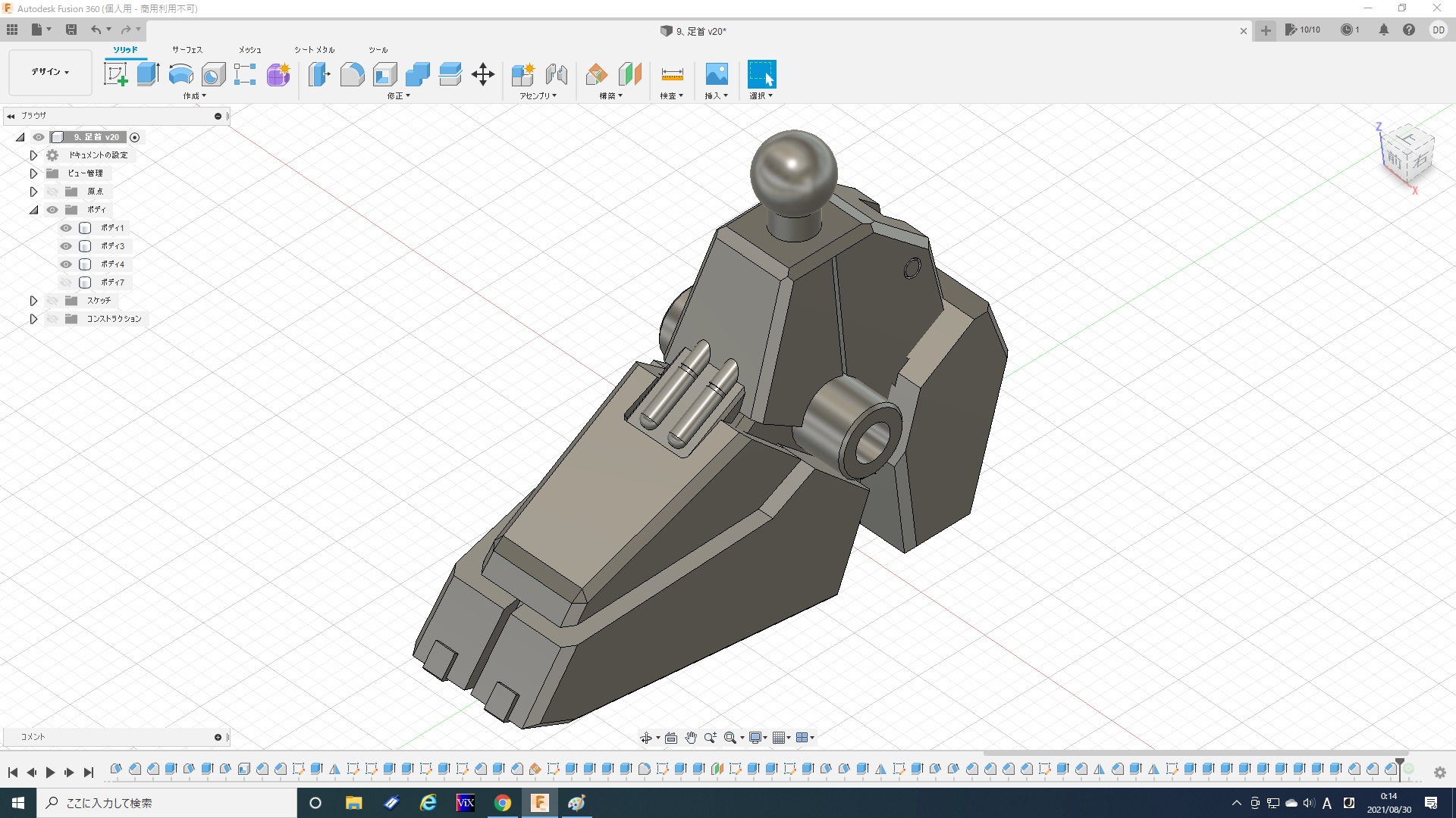 実はこれでも1/5程度にまで面を減らしてます。最初は一つ進むだけでも数分かかったりフリーズしたりと計算が重すぎて、全然やってられないレベルですごく悩みました。ま、ゴムみたいに見えなくもないから、いっか。と、なんとか自分を励まし(ごまかし)、ここで落ち着いた(Give Upした)感じです。トータル6時間。『Fusion360』を始めたばかりの頃を思い出しました(苦笑)。