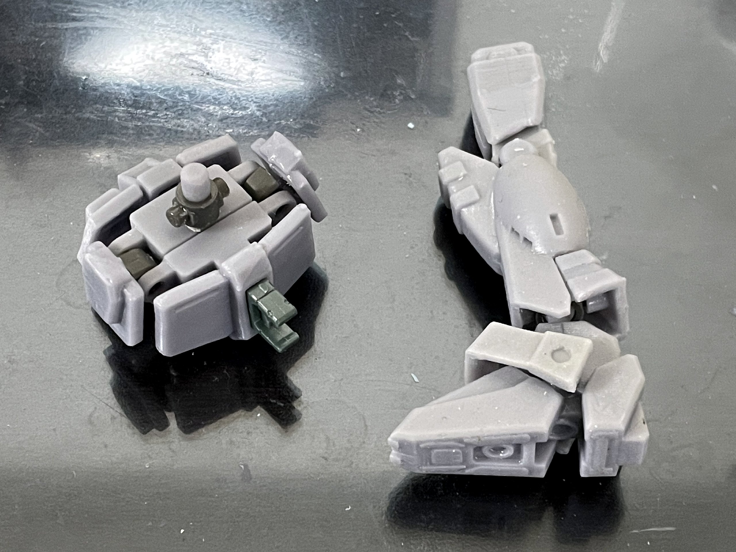 足首に関しては、形状は申し分なく出せましたが、肝心のボールジョイントが若干大きくてポリキャップに入らず……、フレームに関しては、股関節用のポリキャップにはバッチリ!だったのですが、サイドアーマー用の方の穴は若干小さくて入らず……、結局は両方とももう一回出し直し(泣)。